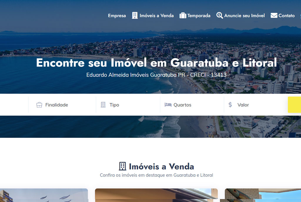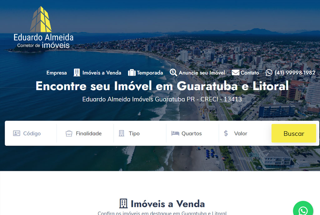 Eduardo Almeida é corretor de Imóveis que atua com sua equipe no mercado de compra, venda e no aluguel de temporada de imóveis de Guaratuba a mais de 28 anos. Com escritório próprio na Avenida principal, no centro da cidade de Guaratuba, o que facilita o acesso e o atendimento aos seus clientes.